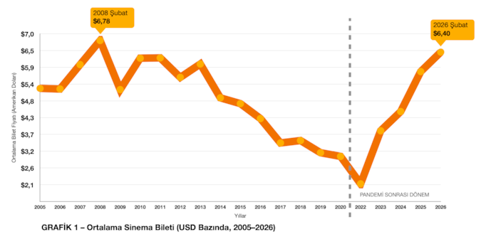 Box Office Türkiye kurucusu Tolga Akıncı tarafından hazırlanan analizde, sinema bileti ortalama fiyatları ilk olarak dolar bazında ele alındı. Buna göre Türkiye genelinde ortalama sinema bileti fiyatı, 2026 yılının 8. hafta verileri esas alındığında, dolar karşılığı açısından 2008 yılından (6,78 dolar) bu yana ölçülen en yüksek seviyeye ulaştı.
