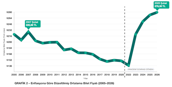 Bu doğrultuda ortalama bilet fiyatları, Türkiye İstatistik Kurumu’nun (TÜİK) açıkladığı Tüketici Fiyat Endeksi (TÜFE) verileri kullanılarak enflasyona göre yeniden hesaplandı. Çalışmada her yılın ortalama bilet fiyatı, satın alma gücü korunacak şekilde Ocak 2026 fiyat seviyesine uyarlanarak karşılaştırıldı.